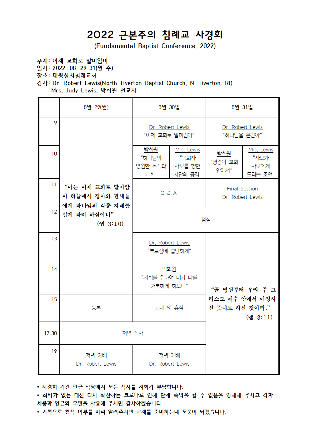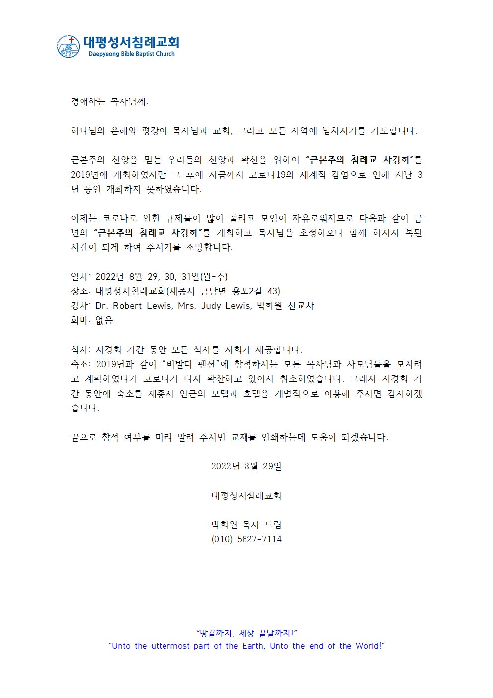 * 사경회 기간 인근 식당에서 모든 식사를 저희가 부담합니다.