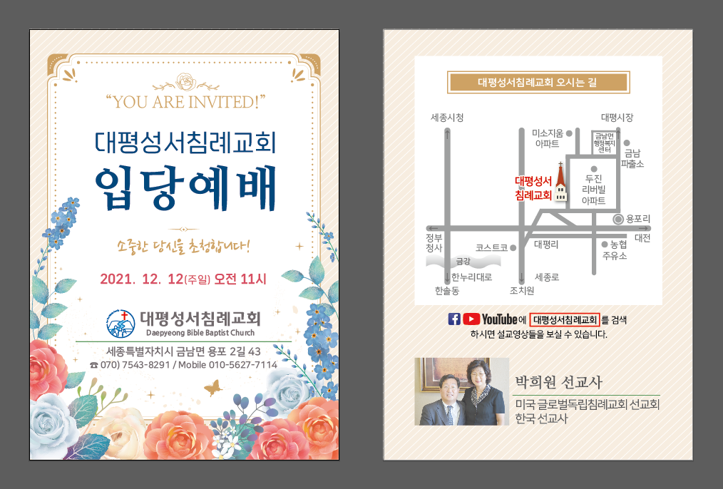 그동안 우리 하나님의 크신 은혜와 많은 목사님들의 기도를 힘입어 "금강성서침례교회"가 새로운 예배당에서 입당예배를 드리면서 교회명이 소재지 동 이름을 따라 "대평성서침례교회"로 변경됨을 아울러 알려드립니다. 입당예배를 기하여 친교회의 많은 목사님들을 모시고 함께 헌당예배를 드리는 것이 바람직하지만 2022년 3월에 교회 3주년 기념 예배를 계획하면서 그때 목사님들을 모시고자 하오니 양해하여 주시면 감사하겠습니다.