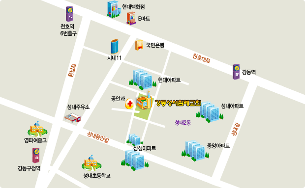 - 지하철 : 8호선 강동구청역과 5호선 천호역에서 도보로 10분 거리