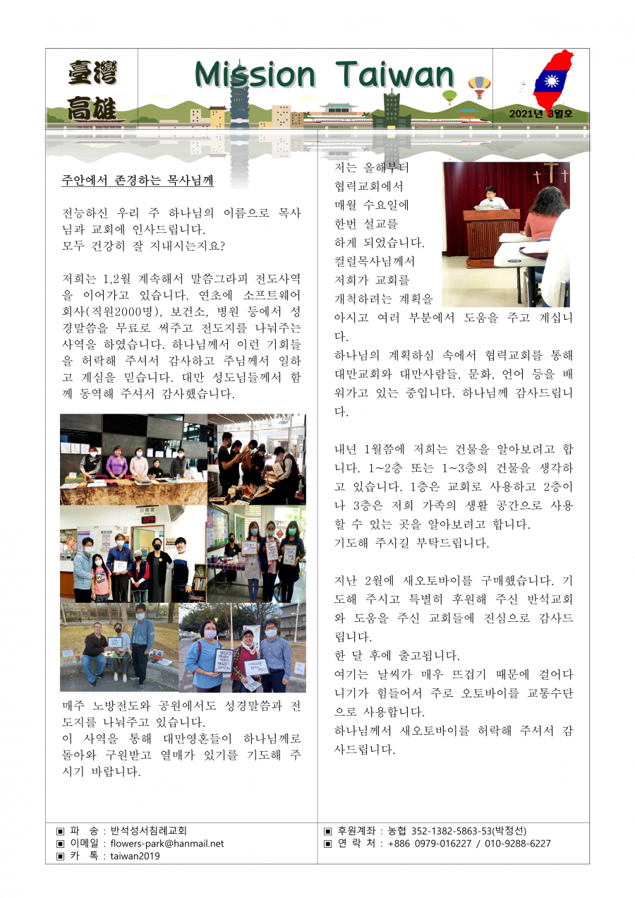 4.대만사역을 배우고 주님의 계획하심 속에 때가 되면 가오슝에 교회가 개척되도록(장소, 건물)